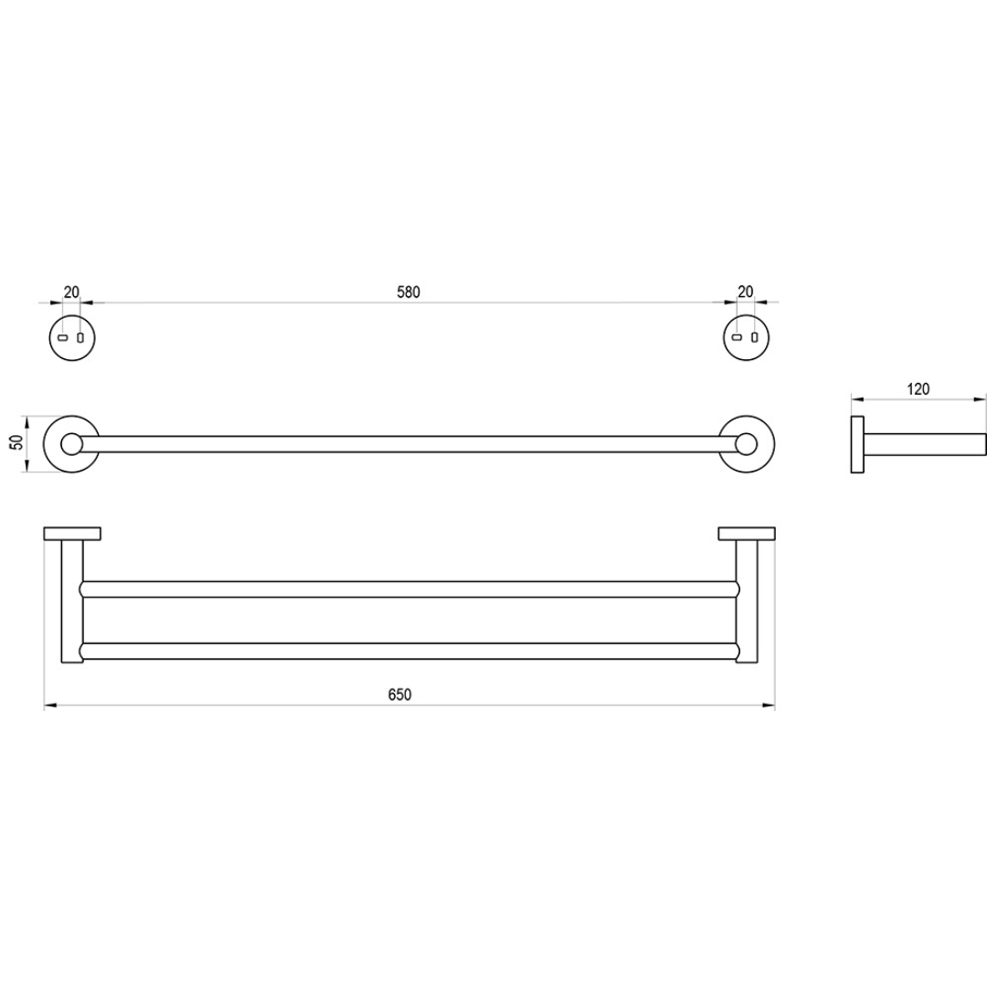 - Подвійний тримач для рушників та банних рушників кріпиться на чотирьох дюбелях та двох металевих регулювальних пластинах. Відстань між гвинтами становить 20 мм. Монтажний комплект входить до комплекту. Для зовнішнього очищення рекомендуємо використовувати засіб Ravak Cleaner Chrome.