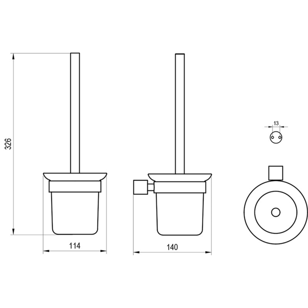 - Тримач з туалетною щіткою та контейнером кріпиться на двох дюбелях та регулювальній металевій затискній пластині. Відстань між гвинтами становить 13 мм. Монтажний комплект входить до комплекту. Тримач оснащений пластиковим кільцем з внутрішньої сторони для м’якого прилягання скляного контейнера. Для зовнішнього очищення рекомендуємо використовувати засіб Ravak Cleaner Chrome.