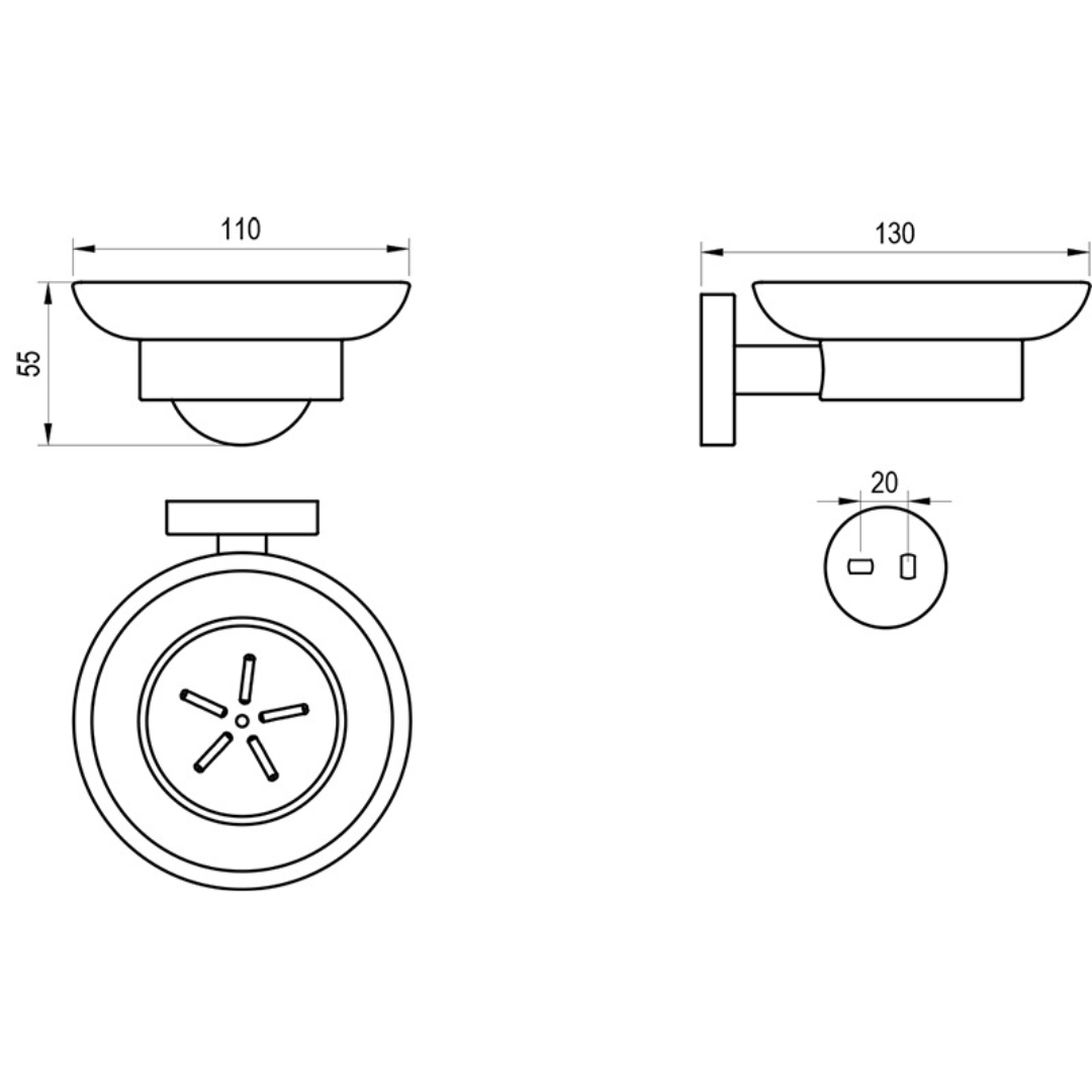 - Тримач для мильниці кріпиться на двох дюбелях та регулювальній металевій затискній пластині. Відстань між гвинтами становить 20 мм. Монтажний комплект входить до комплекту. Тримач оснащений пластиковим кільцем з внутрішньої сторони для м’якого прилягання скляної ємності. Для зовнішнього очищення рекомендуємо використовувати засіб Ravak Cleaner Chrome.