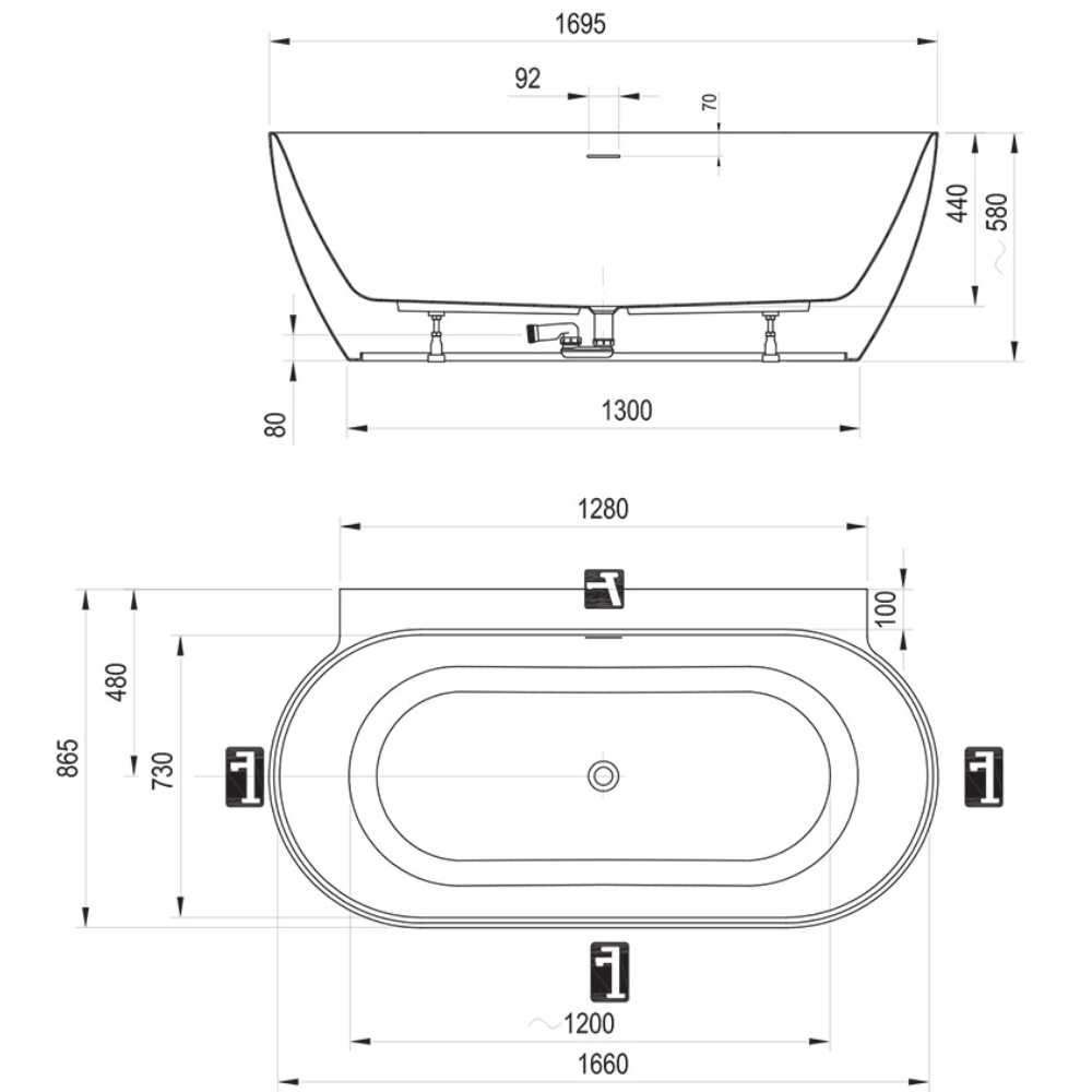 Ванна не может быть дополнена шторкой. Комплект для слива ванны (перелив, ливень, сифон, гидрозатвор) и опора (ножки) входят в комплект.